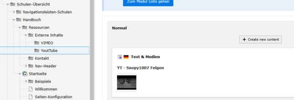 Im Inhalt des entsprechenden Ordners, legen Wir ein Inhaltselement vom Typ “Text & Video” an. Geben Sie dem Element einen aussagekräftigen Namen um diesen dann bei der Verlinkung mit dem Plugin schnell zu finden. Unser Beispiel wurde dabei nach dem folgenden Schema erstellt.